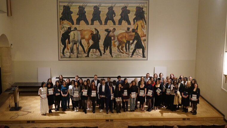 Gruppenbild in der Aula (im Foyer steht eine Fotowand für individuelle Aufnahmen bereit)